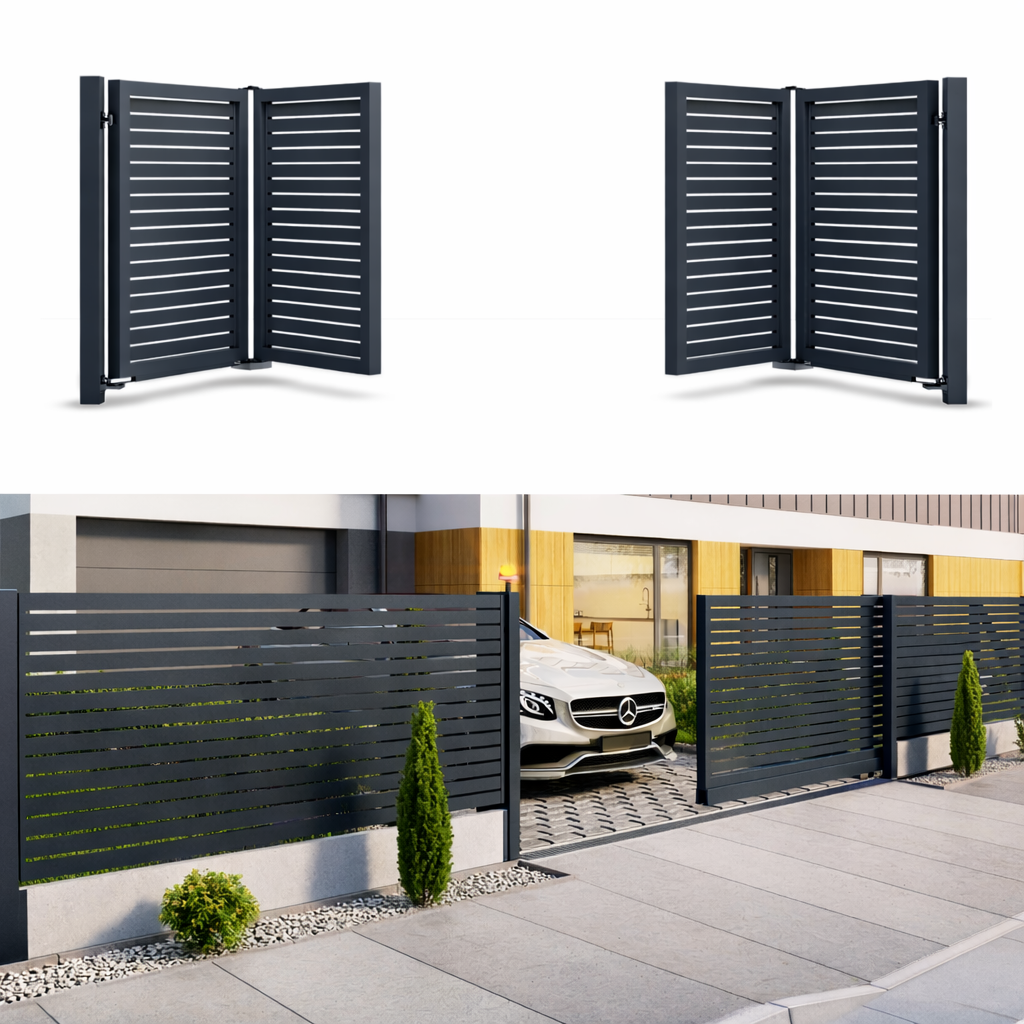 Das Tor wurde feuerverzinkt und in einem eleganten, anthrazitfarbenen Farbton mit matter Feinstruktur (RAL 7016 MDS) pulverbeschichtet. Diese Farbe fügt sich harmonisch in die Gartenumgebung ein und verleiht ihr einen modernen Charakter.