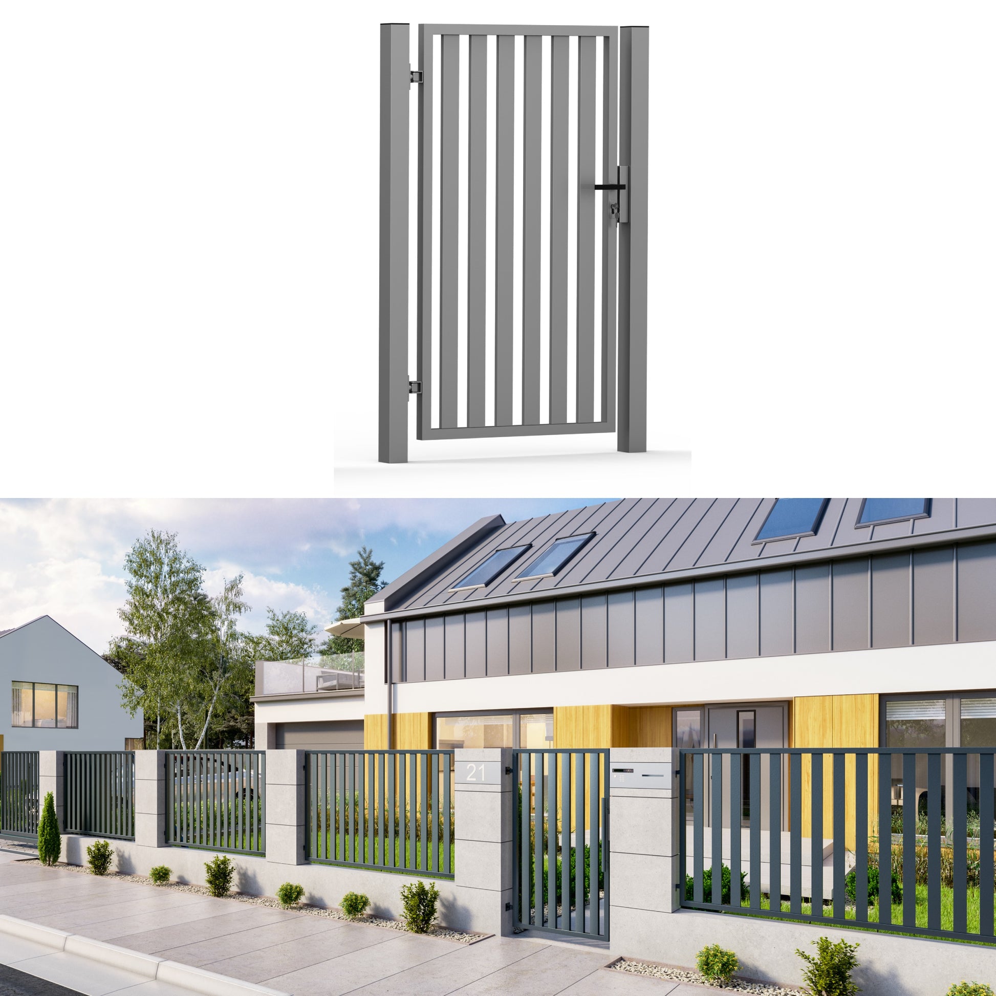 Die Pforte Vertical ist eine moderne Pforte mit einer senkrechten Füllung aus 70×20 mm Profilen, die in geringen Abständen angeordnet und in einen stabilen, geschlossenen Rahmen eingeschweißt sind.
