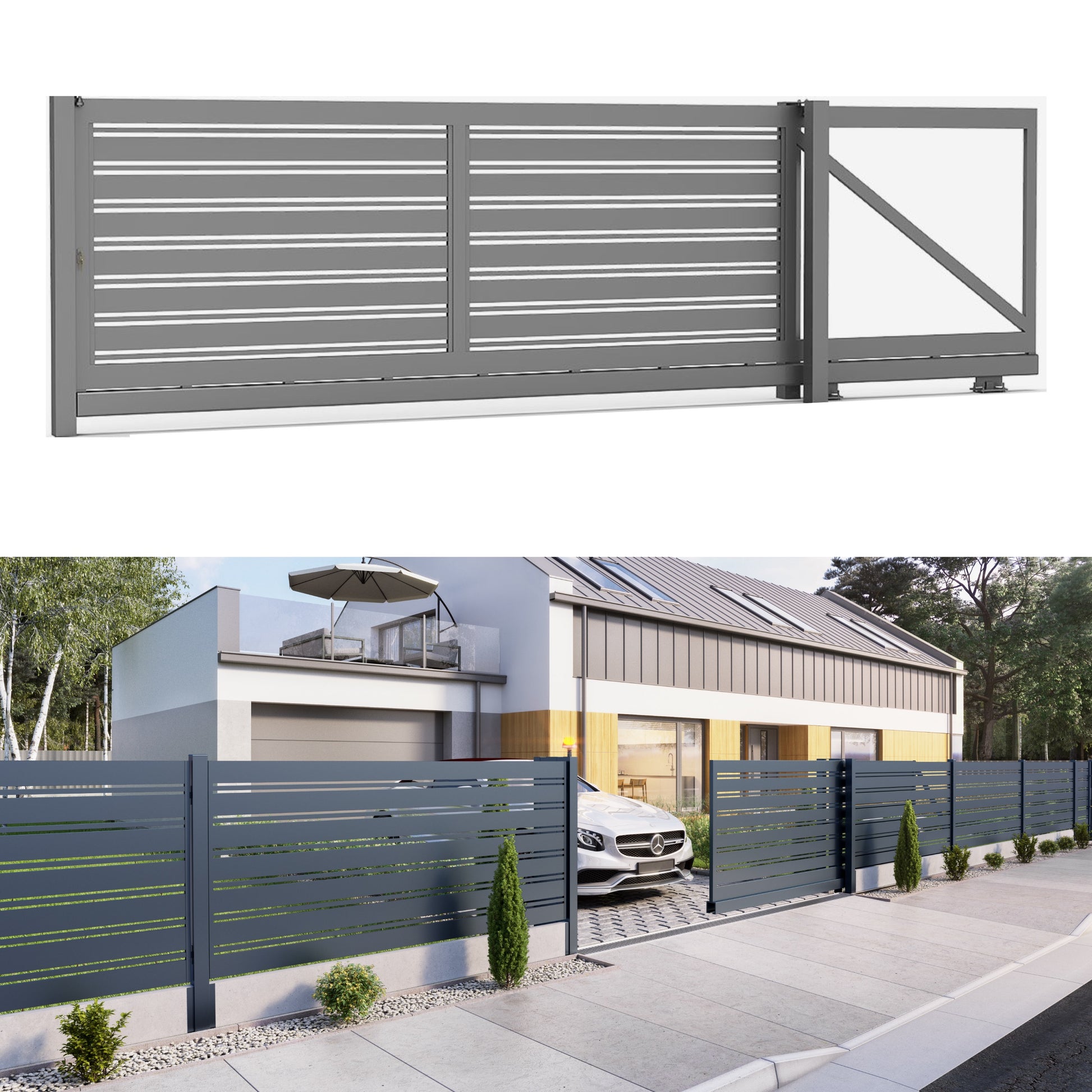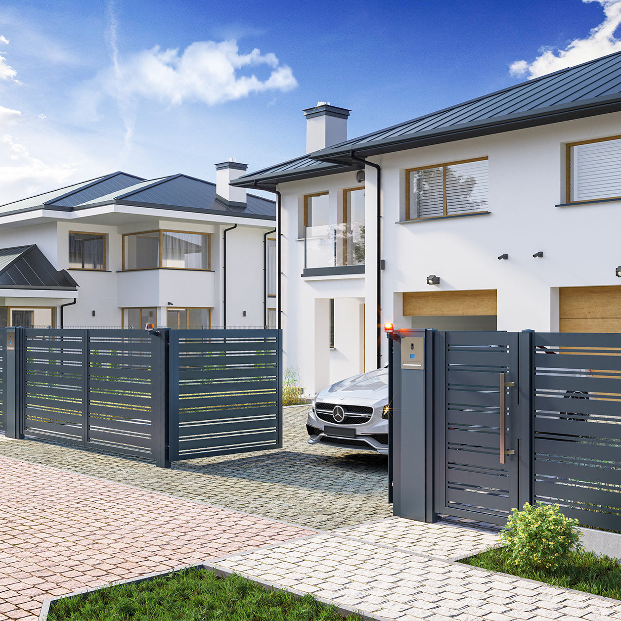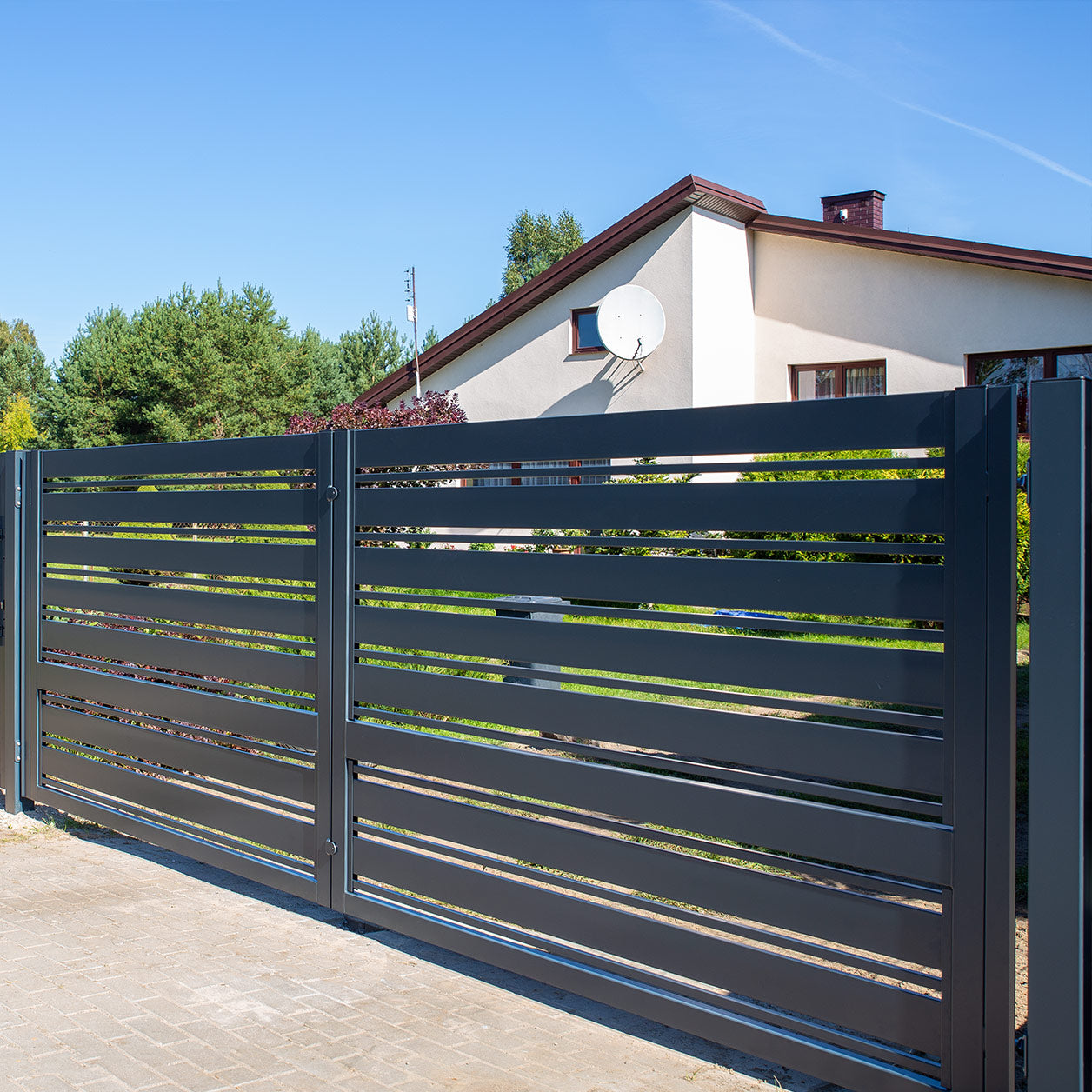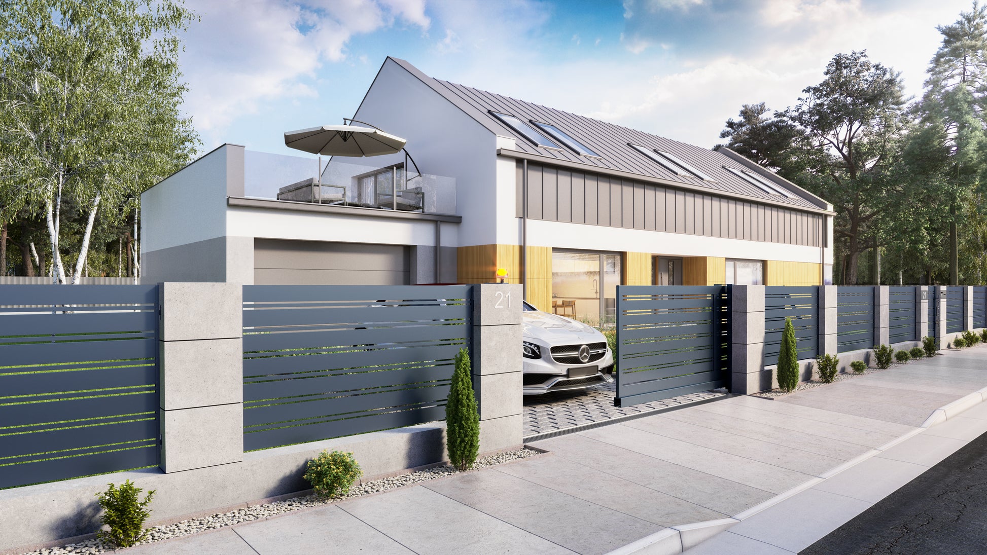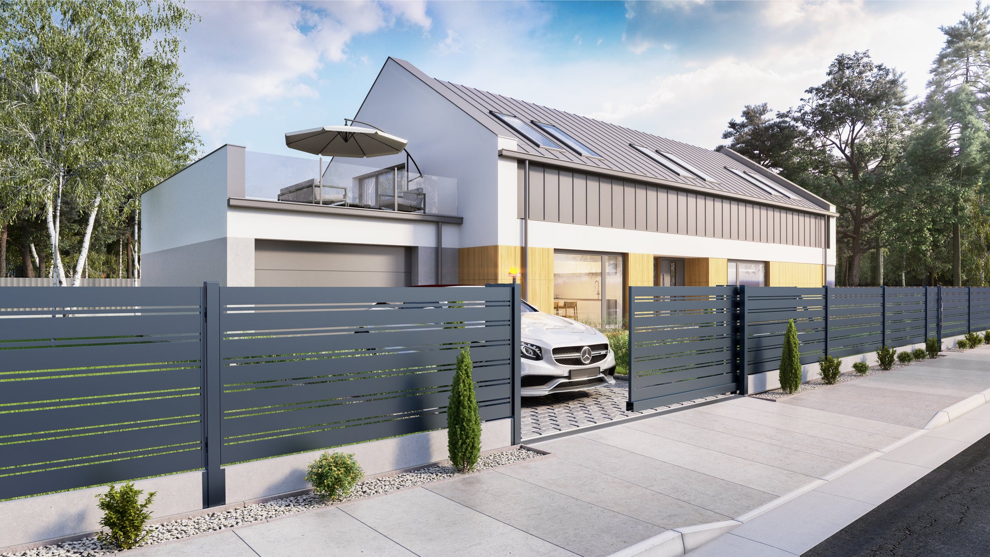 Splendid – ein Vorschlag für ein Palisadenelement mit interessantem und modernem Design. Die Füllung besteht aus geschlossenen Profilen mit einer Höhe von 120 mm und 20 mm, die in ungleichmäßiger Anordnung mit geringen Abständen montiert sind – das sorgt für einen praktischen Sichtschutz des Grundstücks.