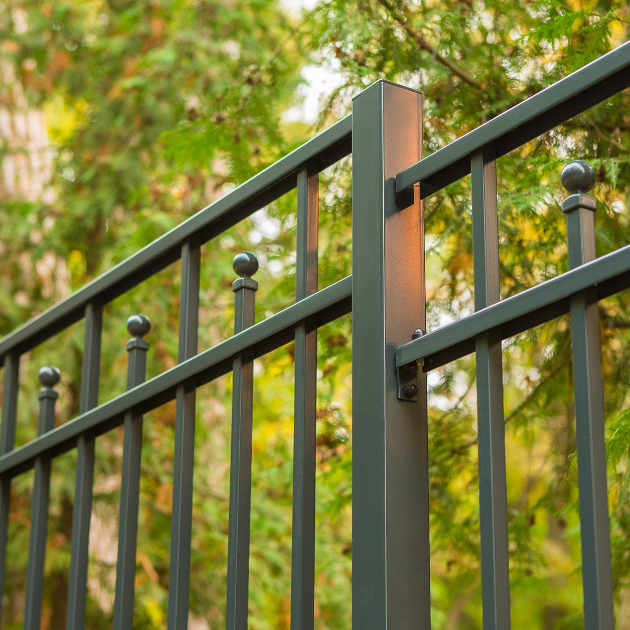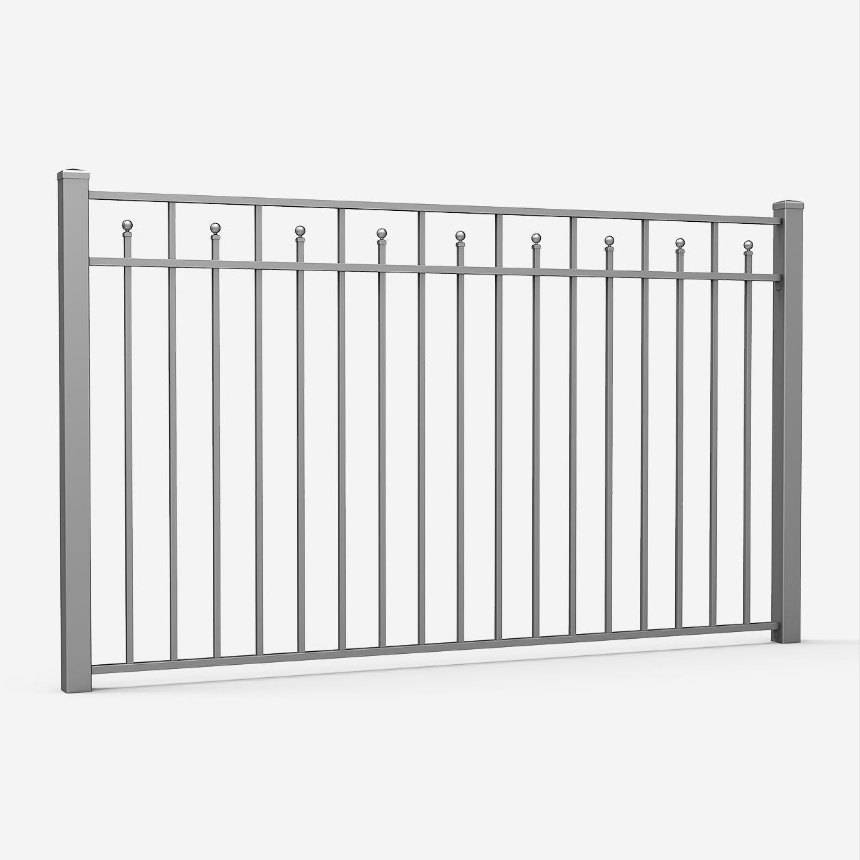 Residence – Palisaden-Zaunfeld, das sich durch ein elegantes und klassisches Design, eine präzise Verarbeitung sowie außergewöhnliche ästhetische Eigenschaften auszeichnet. Die stabile und steife Konstruktion besteht aus einer Füllung aus geschlossenen Profilen 20×20 mm, die an drei horizontalen Quertraversen aus Stahl-U-Profilen verschweißt sind. Jedes zweite Füllprofil ist mit einer dekorativen Kugel abgeschlossen.