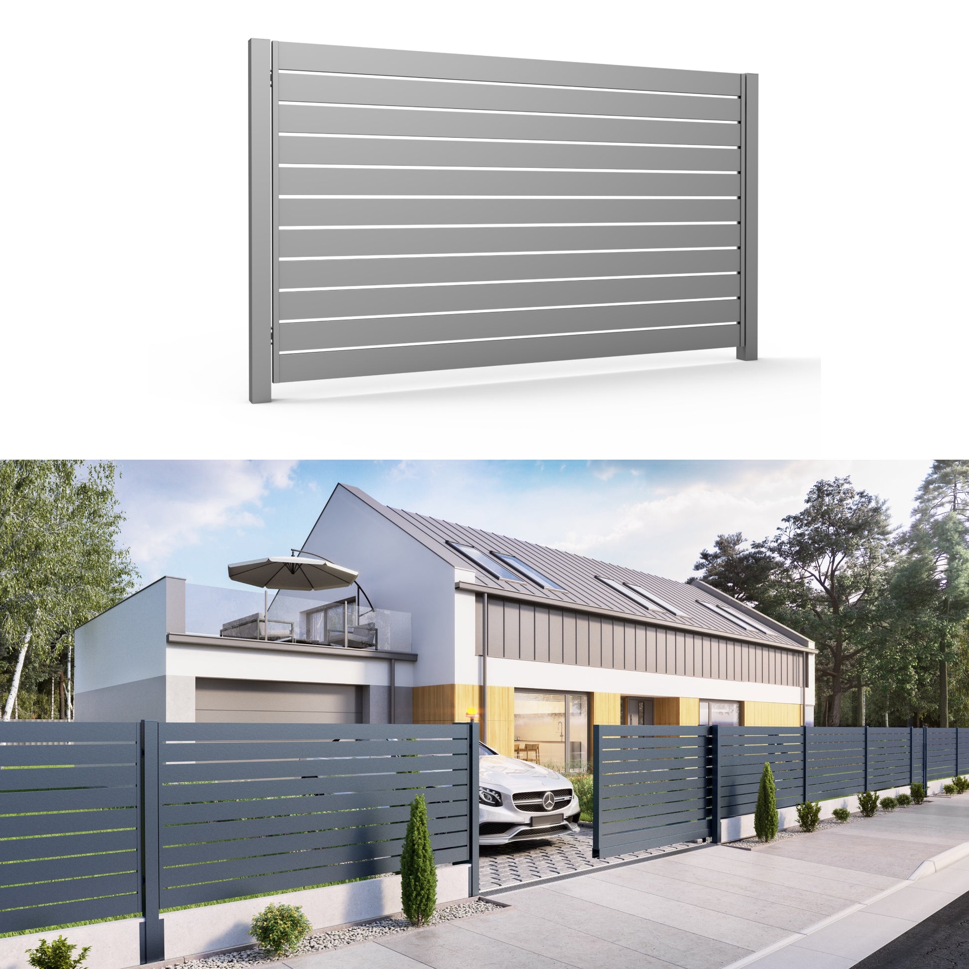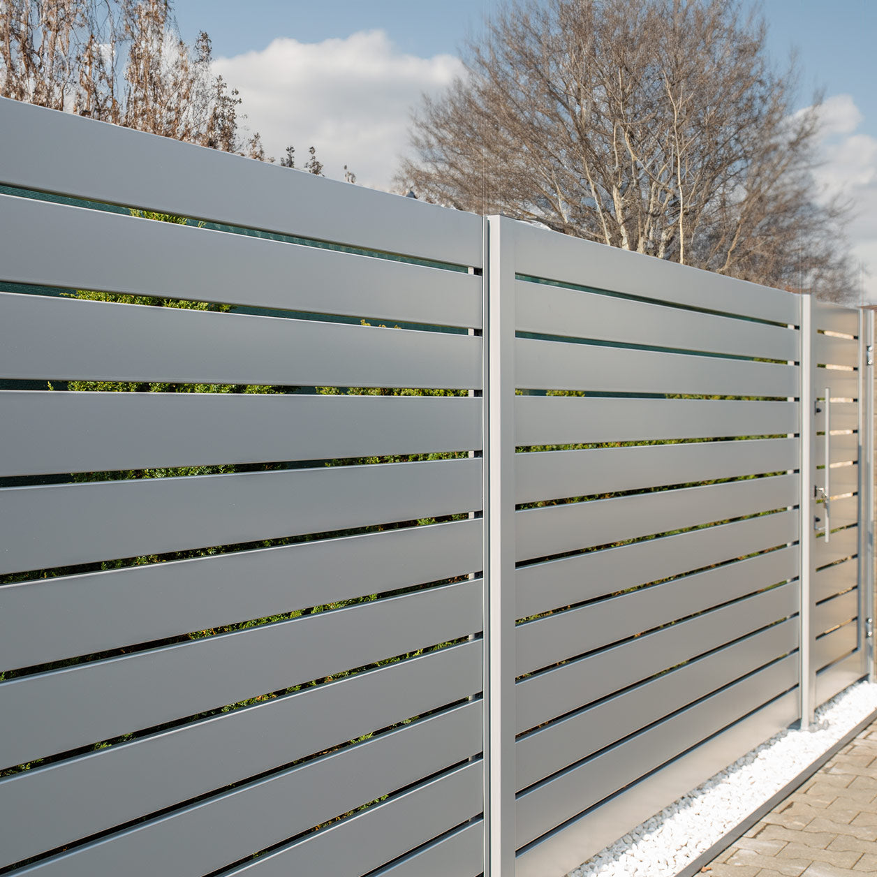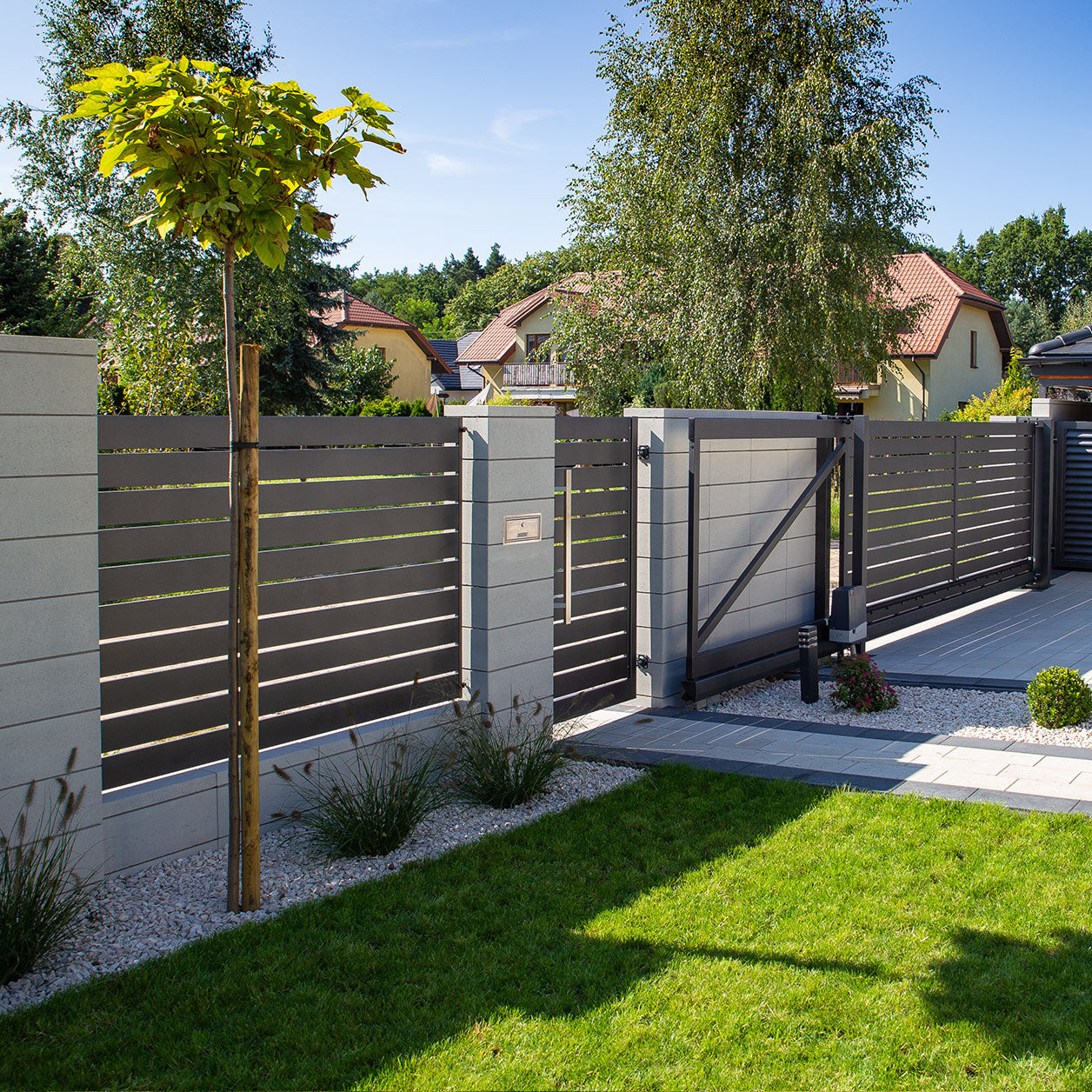 Supreme Mk II – ein modernes Palisaden-Zaunfeld mit äußerst effektvollem und minimalistischem Design, ohne sichtbare Schweißnähte, mit sehr schmalen Abständen zwischen den Füllprofilen mit großer Frontfläche (Profile: 120×20 mm).