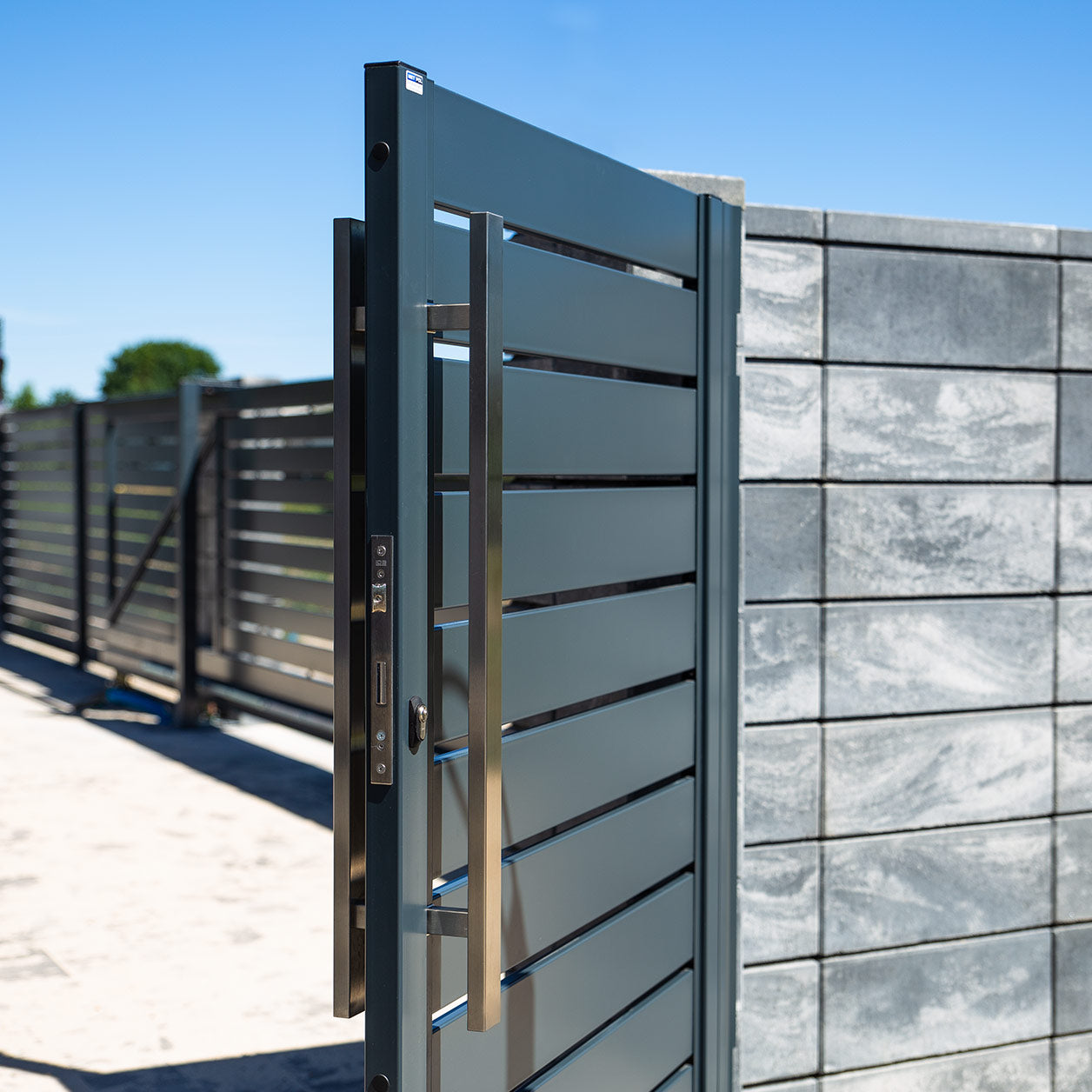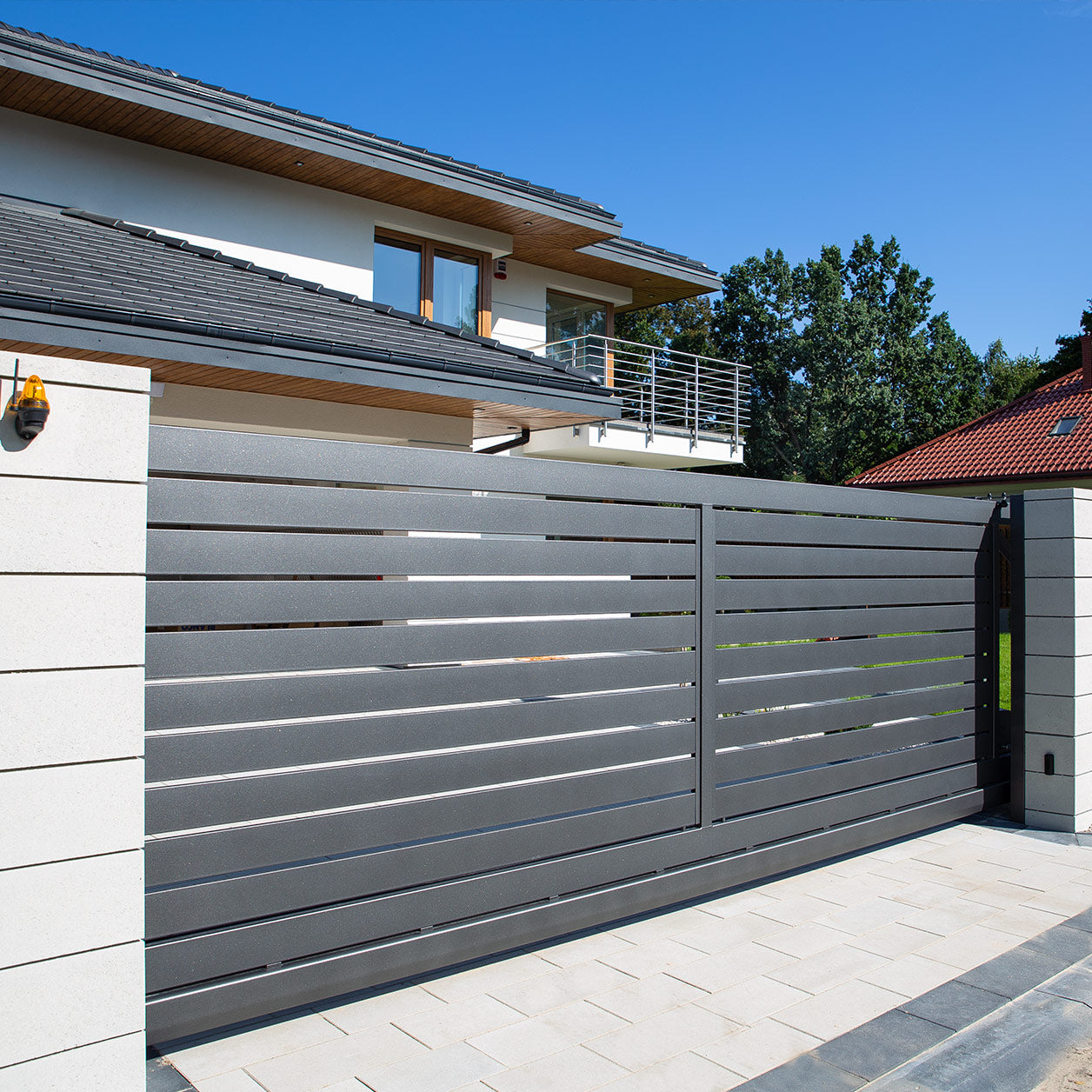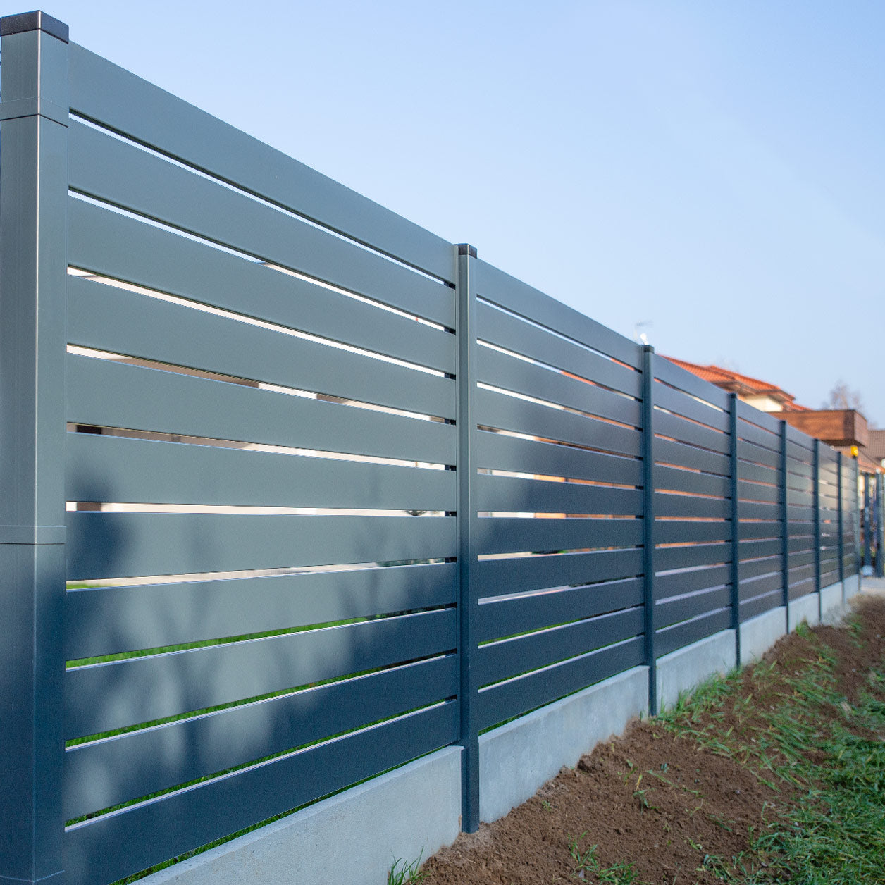 Supreme Mk II – ein modernes Palisaden-Zaunfeld mit äußerst effektvollem und minimalistischem Design, ohne sichtbare Schweißnähte, mit sehr schmalen Abständen zwischen den Füllprofilen mit großer Frontfläche (Profile: 120×20 mm).