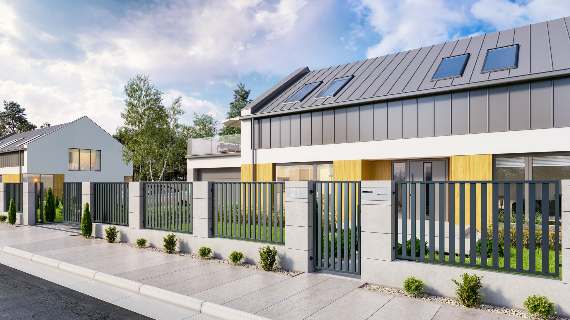 Vertical – ein modernes Palisadenfeld mit vertikaler Füllungsanordnung, gefertigt aus 70×20 mm Profilen, die in geringen Abständen in einen geschlossenen Rahmen aus 40×40 mm Profilen eingeschweißt sind. Das Modell Vertical zeichnet sich durch eine solide und langlebige Konstruktion sowie ein schlichtes und inspirierendes Design aus. Die Vertical-Felder werden in Höhen von 1,09 m bis 1,83 m und in zwei Standardbreiten von 2,0 m und 2,54 m hergestellt. Korrosionsschutz: Feuerverzinkung + Pulverbeschichtung (RAL-Farbpalette).