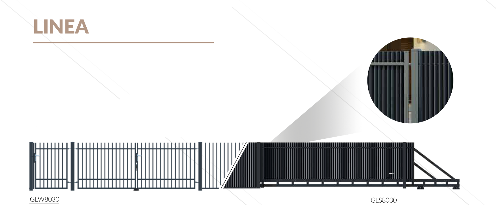 Die Kollektion Linea zeichnet sich durch ein minimalistisches, offenes Design aus. Die Anordnung der Profile schafft eine rhythmische Komposition, die sich perfekt in die Architektur des Hauses einfügt. Es ist ein System mit vertikalen Lamellen. Es zeichnet sich durch fehlende Rahmen in den Zaunfeldern aus, was ihm einen modernistischen Charakter verleiht.